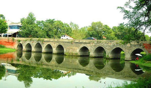 老城九孔橋:自明弘治十年(公元1497年)到建國后的1950年10月老城鎮(zhèn)一直是沈丘縣治所所在地,城南緊靠東西流向的泉河,當(dāng)時河寬水深,各種貨物可上通漯河,下達(dá)臨泉、潁州(現(xiàn)阜陽市),經(jīng)潁上至正陽入淮河,當(dāng)時是一條繁盛的“黃金水道”。但城南無橋,南北兩岸大量人員來往,貨物運(yùn)送,全靠船渡,因水大、人多、貨物超載或遇急風(fēng)惡浪,每年都有事故發(fā)生。1973年、1981年沈丘縣人民政府兩次撥款4.1萬元,維修九孔橋。因九孔橋是周口至臨泉的主要交通干道,經(jīng)常有幾十噸的大貨車在橋上行駛,常年承受著交通重載,所以到1998年南橋頭西側(cè)倒塌了十幾米,致使車輛無法行走。1999年,沈丘縣人大代表、老城東升布鞋廠廠長郭傳興個人出資5萬元,南關(guān)行政村支部書記張連營負(fù)責(zé)施工補(bǔ)修,把橋加長4米,全橋長達(dá)99米,19天后竣工。現(xiàn)橋體基本完好,車輛行人稱便。