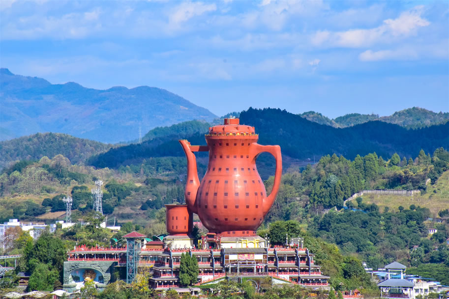 天下第一壺茶文化公園位于貴州省遵義市湄潭縣火焰山山頂。其核心景觀'天下第一壺'壺身高48.2米(含基座總高73.8米),獲上海大世界基尼斯總部認(rèn)證的"最大茶壺實物造型"稱號。公園占地面積6萬余平方米,包含茶文化博物館、中華茶道館、水上樂園等五大功能區(qū),壺頂設(shè)有射程達(dá)20公里的激光燈形成獨特夜景。該公園作為貴州十大魅力景區(qū),形成了'一樓一壺一瓶一林'的遵義旅游新格局。