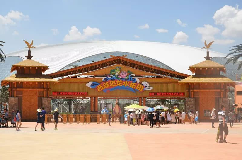 西部恐龍水樂園位于蘭州新區鳳凰山路1555號,總建設用地約2200畝,包含室內外兩大水樂園區域。室內水樂園采用28℃恒溫系統實現全年運營,配備歡樂島、加勒比海灘等17項國際化游樂設施;室外區域設有造浪池、叢林旋渦等12組水上游樂設備。園區以恐龍為主題,布置仿真模型及恐龍化石展品,兼具科普教育與娛樂功能。