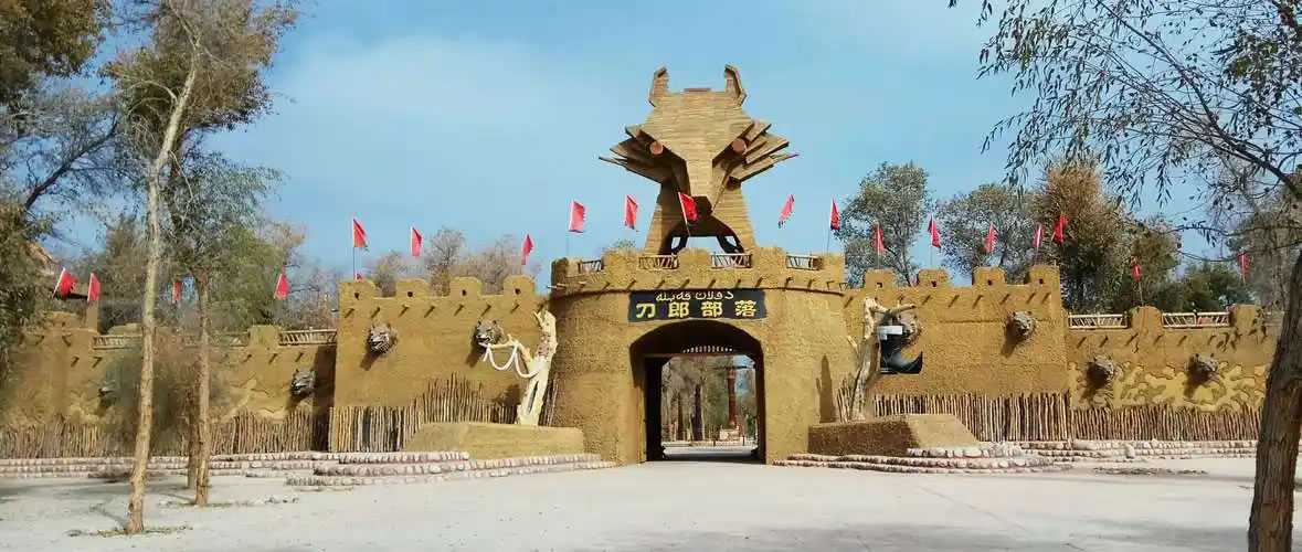 刀郎部落,位于新疆維吾爾自治區阿克蘇地區阿瓦提縣玉滿閘口胡楊林區,距阿克蘇市58公里、縣城18公里,占地面積8300畝。景區以5000余畝千年原始胡楊林為生態背景,完整呈現刀郎人建筑、飲食及民俗文化,集中展示刀郎木卡姆、刀郎麥西熱甫等8項國家級和自治區級非物質文化遺產,其中“刀郎演唱組合”保持著最大年齡民間歌舞組合的大世界基尼斯紀錄。核心功能區包含民俗展館、千年胡楊區、鴕鳥養殖園區等七大板塊,復原刀郎人傳統居所與勞作工具,設有傳統手工藝作坊和勇士競技場,每日開展刀郎麥西熱甫展演、民俗婚禮體驗及摔跤、叼羊等傳統體育活動。2025年入選非遺進景區“五好”案例名單,通過非遺傳承人駐場表演、慕薩萊思釀造工藝展示及沙雕主題公園等特色項目,形成生態觀光與民俗體驗深度融合的旅游模式。景區內保留狩獵場景、農民畫長廊及高空輪轉秋千表演,配套沉浸式互動體驗和文創開發體系,實現刀郎文化的活態傳承。