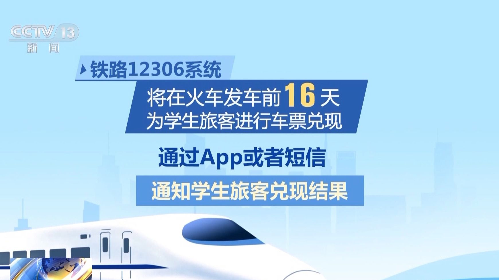 鐵路12306系統將在火車發車前16天為學生旅客進行車票兌現,并通過App通知或者短信通知學生旅客兌現結果。車票兌現成功后,學生旅客需在當日23時前,在鐵路12306App中完成預約購票訂單支付。