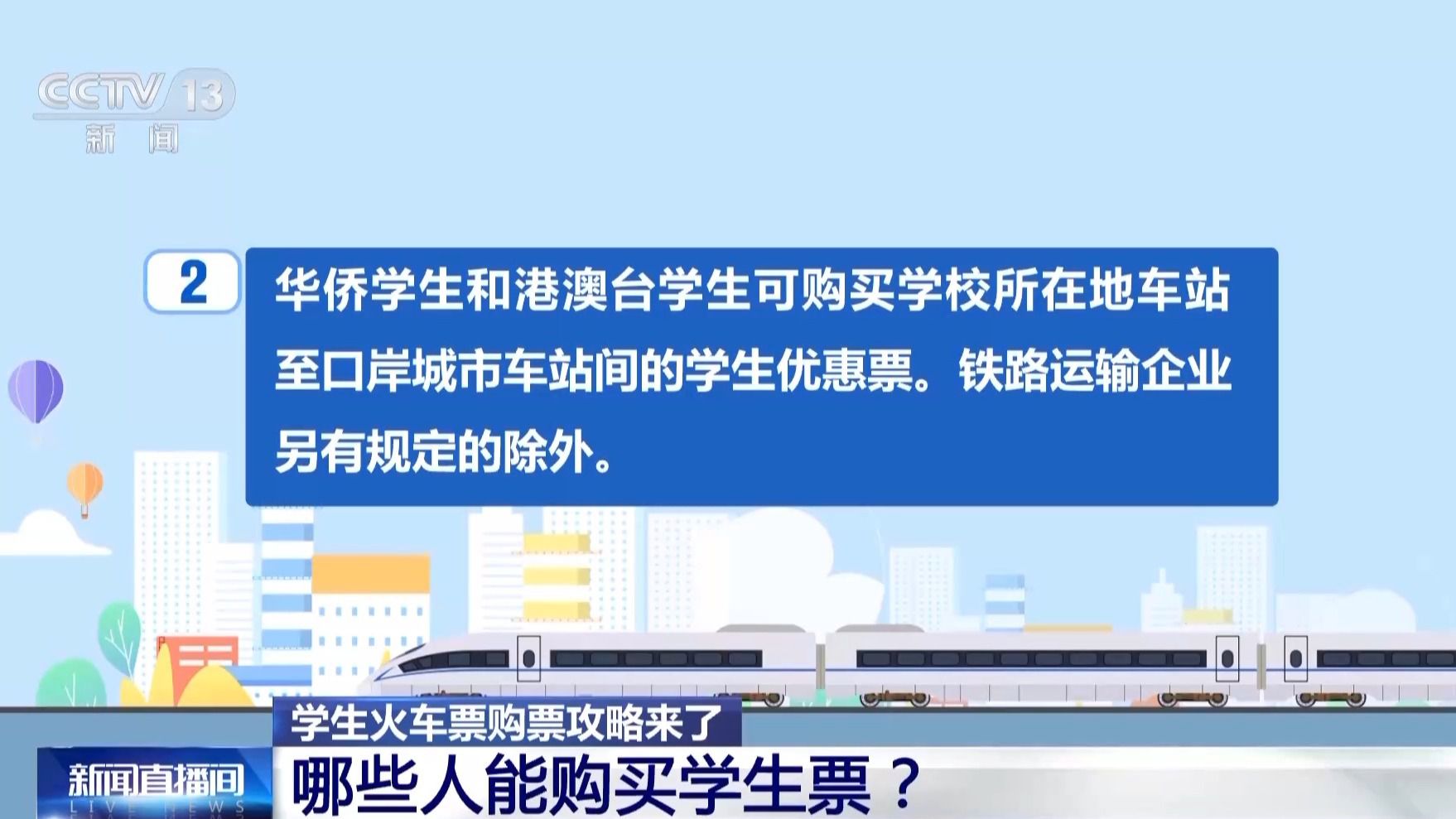 華僑學生和港澳臺學生可購買學校所在地車站至口岸城市車站間的學生優惠票。鐵路運輸企業另有規定的除外。