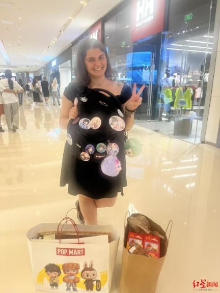 同樣來成都玩的,還有27歲的意大利女孩瑪?shù)倌龋∕artina)。6月25日下午,瑪?shù)倌日诔啥嫉囊患遗菖莠斕氐赀x購。看到琳瑯滿目的潮流玩具,瑪?shù)倌纫贿M去就是半小時以上,足足選了一大袋才出來,“在意大利,泡泡瑪特的店鋪不多,商品品種也沒有這么齊全。”