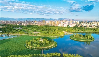 雨后初晴的甘肅省張掖國家濕地公園碧水藍天,綠意盎然,景美如畫。
