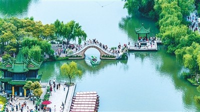 隨著“蘇超”破圈,江蘇揚州借勢發力,推出“看球+賞景”文旅套餐,圖為游客在瘦西湖風景區賞景游玩。