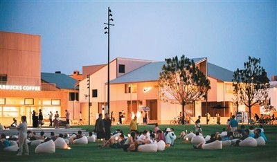 游客在秦皇島阿那亞社區內的街區廣場上休閑。