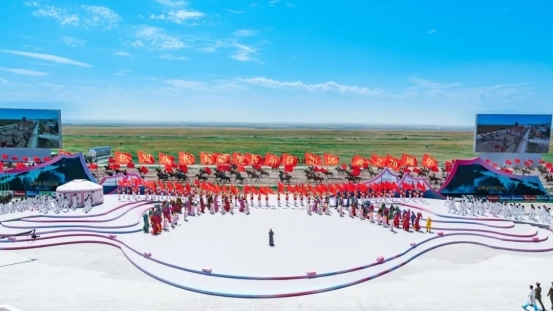 開(kāi)幕式尾聲中,全體演員深情合唱《歌唱祖國(guó)》。同時(shí),氣勢(shì)恢宏的“萬(wàn)馬奔騰”表演在喀爾坎特草原激情上演,將整場(chǎng)演出再度推向高潮。
