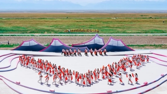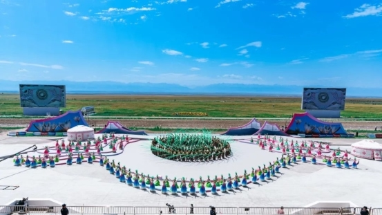 2025’新疆伊犁天馬文化旅游節(jié)開(kāi)幕式舞臺(tái)以巍峨的天山和遼闊的草原為背景,文藝演出由“蹄印千年·絲路新顏”、“蹄印千年·絲路新韻”、“蹄印千年·絲路新潮”三大篇章及尾篇組成。開(kāi)幕式文藝演出在開(kāi)場(chǎng)歌舞《團(tuán)結(jié)一心襄盛會(huì)》中拉開(kāi)序幕,展現(xiàn)了各族群眾團(tuán)結(jié)奮進(jìn)、銳意進(jìn)取的精神風(fēng)貌。
