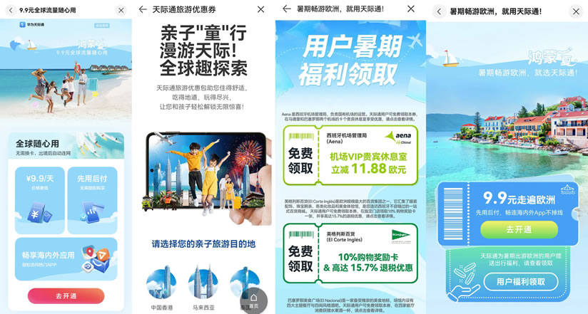 暑期,天際通為計劃出境游的用戶特別推出了“全球隨心用”活動,境外流量9.9元包天,每天有5GB高速流量,活動覆蓋港澳、新馬泰、日韓、歐洲、澳大利亞、美國(本土地區)等50個國家地區,多重優惠讓境外出行更劃算。華為天際通還為出行亞洲、歐洲的用戶提供了多地旅游優惠權益,涵蓋機票酒店、旅游景點、吃喝玩樂等各個方面,更多精彩等你來發現!
