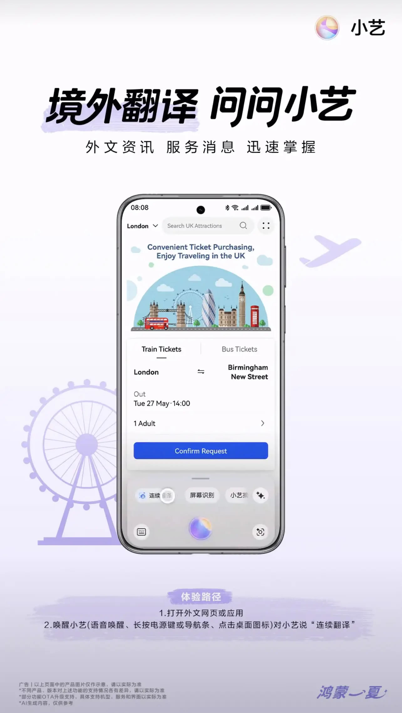 出境游線上點餐、使用本地應用或瀏覽網站時,外文語言不通常常成為攔路虎。升級鴻蒙5的用戶可以用小藝“連續翻譯”功能解決。長按小藝導航條,點擊“連續翻譯”服務即可體驗,一次開啟就能實現屏內邊瀏覽邊翻譯的系統級連續翻譯體驗,支持截屏、文檔、瀏覽器等全場景的連續性翻譯。如果是面對面點餐、問路等場景,也可以跟小藝說“小藝翻譯助手”,該翻譯Agent提供文本翻譯、同聲傳譯、面對面翻譯功能,讓出境游無障礙溝通。