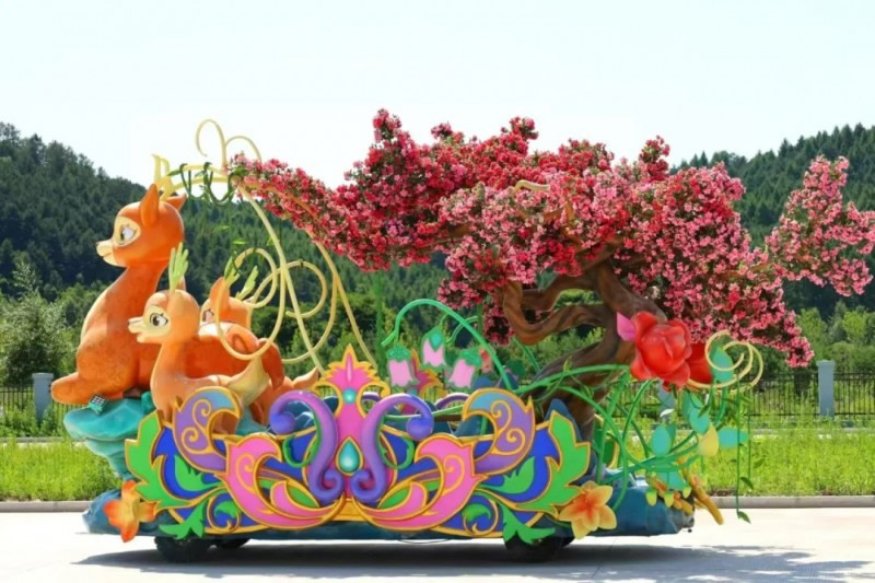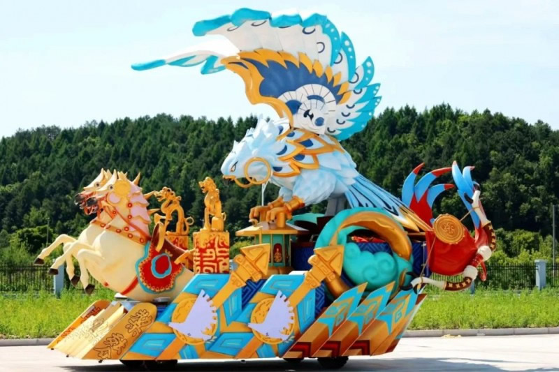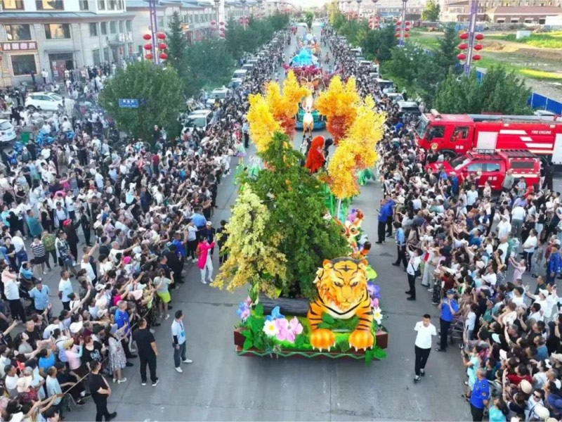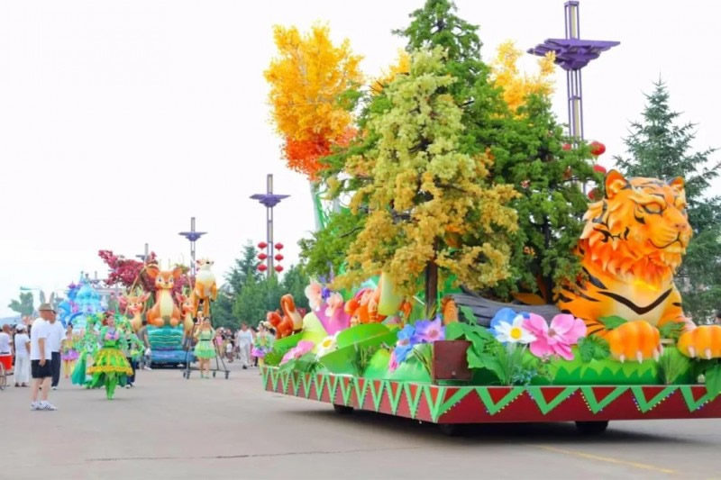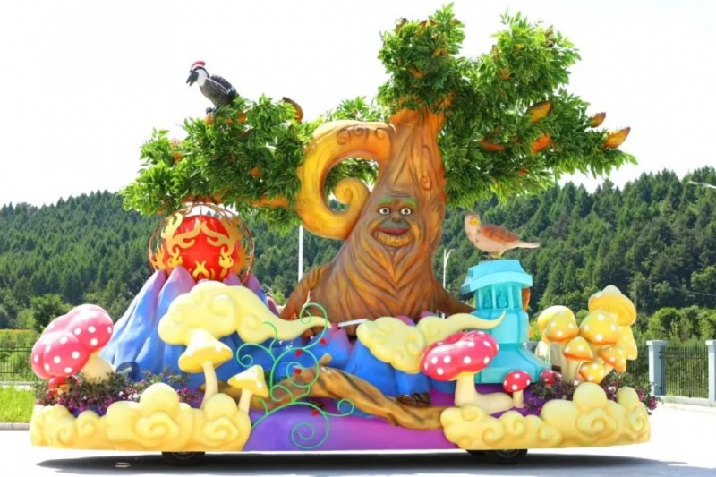 花車設計不僅注重視覺沖擊力,更融入動態特效:虎頭擺動、翅膀扇動、雪花機噴灑等細節,讓靜態的造型煥發生命力。夜幕降臨時,花車更以夜光效果點亮林海,為觀眾呈現一場光影交織的奇幻盛宴。
