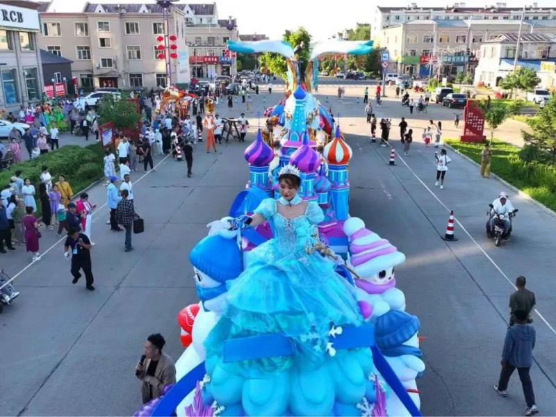 巡游隊伍中,47名專業演員的表演同樣精彩紛呈。“金翎飛霄”方陣的男演員們身著女真武士鎧甲,手持長矛跳起剛勁有力的戰舞;“鐘林毓秀”方陣的女演員則化身森林精靈,輕盈的舞步配合著花車上搖曳的藍莓枝椏,演繹出林間仙境的唯美畫面。演員們還不時走下花車與觀眾互動,教小朋友模仿鄂倫春族的傳統舞蹈動作,現場笑聲不斷。