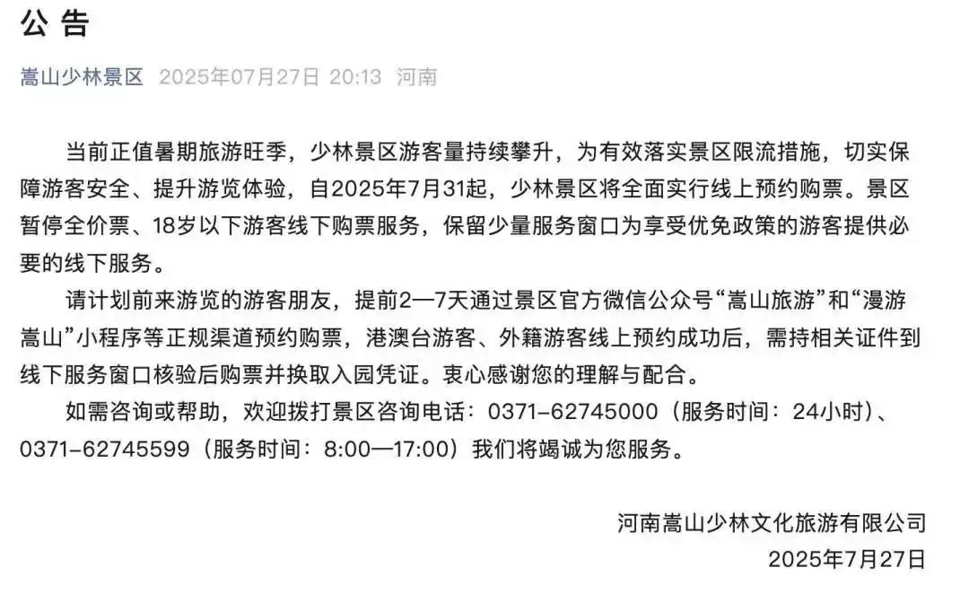 7月27日,嵩山少林景區官方公眾號發布最新消息顯示:當前正值暑期旅游旺季,少林景區游客量持續攀升,為有效落實景區限流措施,切實保障游客安全、提升游覽體驗,自2025年7月31日起,少林景區將全面實行線上預約購票。景區暫停全價票、18歲以下游客線下購票服務,保留少量服務窗口為享受優免政策的游客提供必要的線下服務。