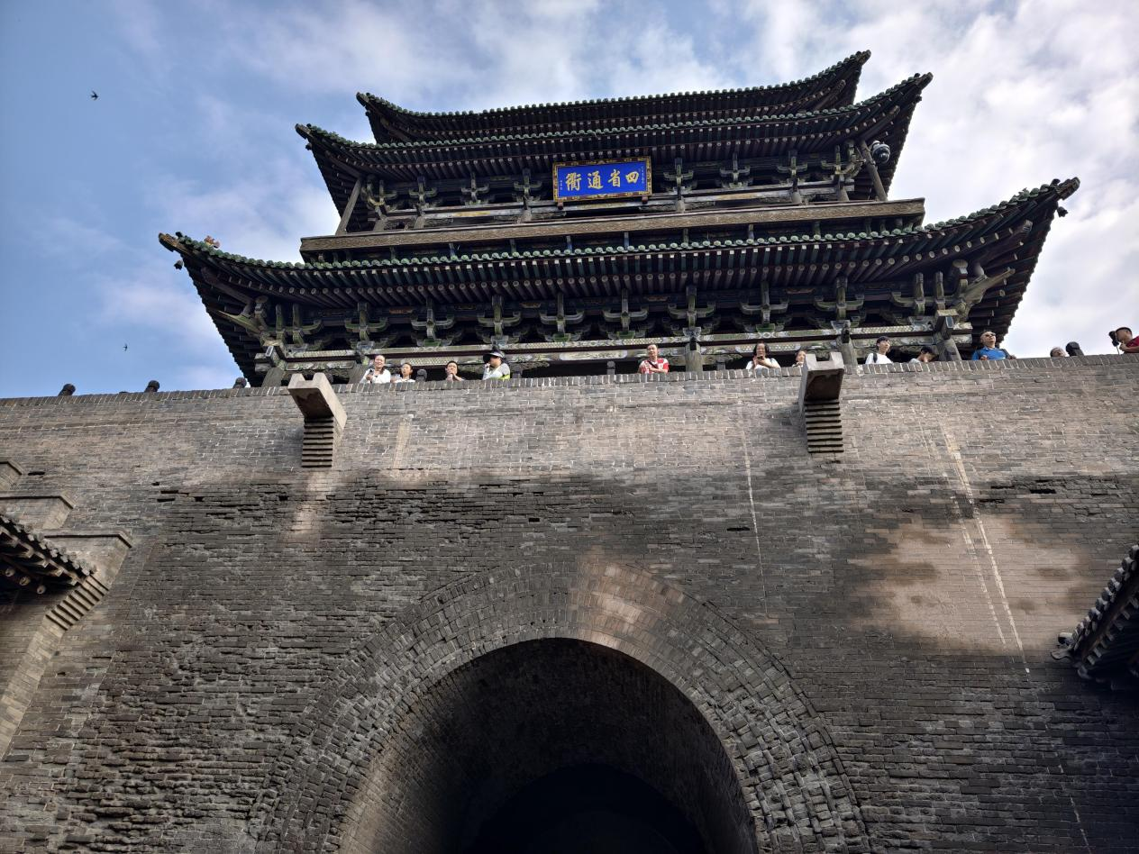 登上古城墻遠眺,6000多米長的城墻巍峨挺拔。據工作人員介紹,現在我們看到的城墻基本上保留了明代的建筑形制,外墻包磚內墻夯土。古城內以南大街為軸線,四大街、八小巷、七十二條蚰蜒巷縱橫交錯,民居、客棧、票號、鏢局等呈東西對稱分布。青磚路面以及上面深深的古車轍印,是古城“四省通衢”的重要見證。