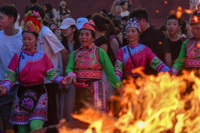 “不用懂專業舞步,跟著大家一起,怎么開心怎么跳!” 在大理州巍山縣拱辰樓廣場,躍動的篝火映紅了古老的城墻,來自西安的游客劉欣已融入當地慶祝火把節的彝族打歌隊伍中。“打歌隊員帶領大家圍著篝火唱跳,簡直太開心了!”她說。