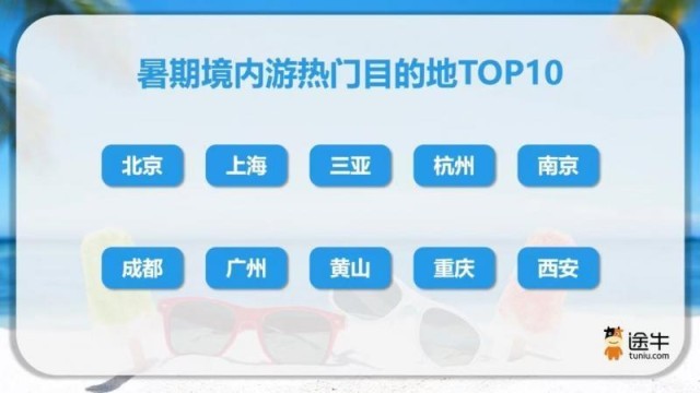 傳統文化游、西南與西北方向的避暑游,以及沿海地區的海濱海島游等成為暑期境內旅游市場的主導。北京、上海、三亞、杭州、南京、成都、廣州、黃山、重慶、西安是截至目前境內游更為熱門的目的地,位列“暑期境內游熱門目的地榜單”前列。