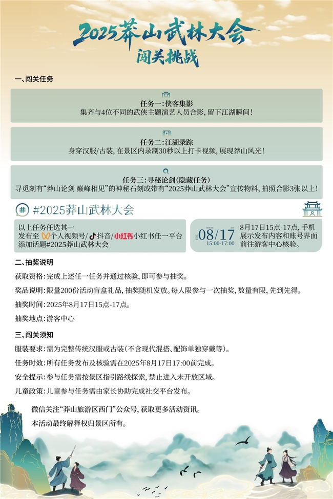 以上關卡任務任選其一,發布至個人視頻號/抖音/小紅書任一平臺,添加話題#2025莽山武林大會,經核驗后即可抽取限定盲盒!
