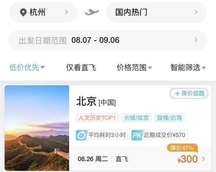 8月7日,記者查詢第三方售票平臺發現,8月26日杭州飛北京經濟艙機票價格僅需300元(不含稅),相當于打了1.3折。8月13日,杭州飛揭陽經濟艙票價最低僅需370元(不含稅),相當于打3.1折。8月27日,杭州出發飛石家莊票價最低僅需330元(不含稅),相當于打2折。