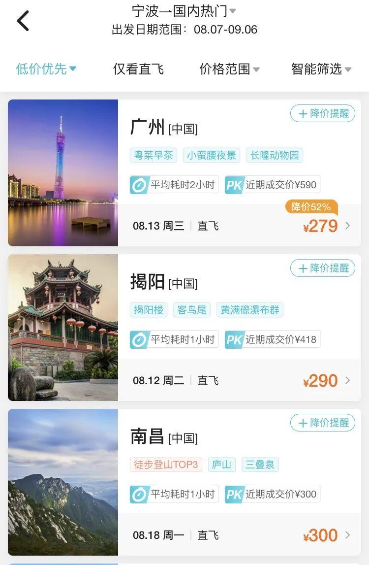 8月中旬,寧波飛廣州、揭陽的機票價格2字頭就可拿下,比如8月13日寧波飛廣州最低票價僅需279元(不含稅),8月12日寧波直飛揭陽機票價格最低僅需290元(不含稅)。