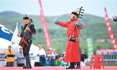 演員在內蒙古自治區第十一屆少數民族傳統體育運動會(巴林右旗分賽場)開賽儀式上表演。