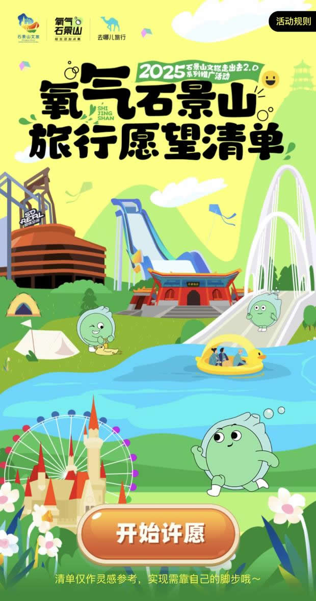 在“去哪兒”旅行APP上線“氧氣石景山”文旅專(zhuān)題頁(yè),不僅整合酒店榜單、景區(qū)門(mén)票、優(yōu)質(zhì)攻略等核心文旅資源,更特別設(shè)置石景山區(qū)對(duì)口支援和協(xié)作地文旅產(chǎn)品版塊,實(shí)現(xiàn)“石景山推廣+支援地區(qū)助銷(xiāo)”雙重價(jià)值。同步推出的“旅行打卡愿望清單”H5,線上用戶(hù)可點(diǎn)亮自己的石景山旅游心愿,生成專(zhuān)屬旅行愿望清單;在高校路演活動(dòng)中,大學(xué)生可分享H5到社交媒體作為參與活動(dòng)的入場(chǎng)券——既為高校活動(dòng)預(yù)熱,更成為高校路演入場(chǎng)憑證,串聯(lián)起“線上互動(dòng)-線下參與”的閉環(huán)。