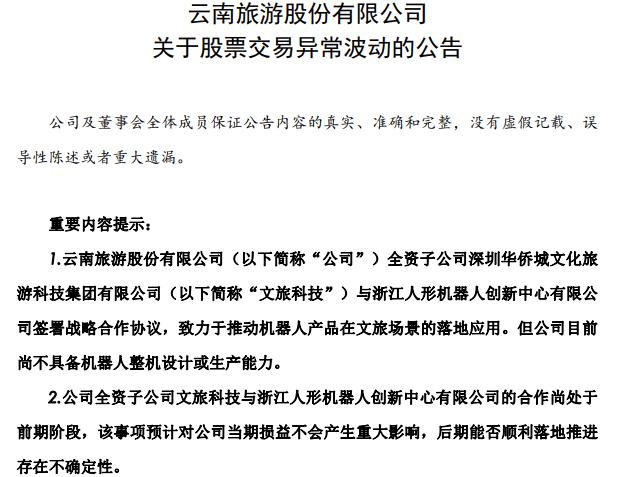 根據云南旅游22日盤后發布的異動公告,目前,雙方合作尚處于前期階段,該事項預計對公司當期損益不會產生重大影響,后期能否順利落地推進存在不確定性。另外,公司目前尚不具備機器人整機設計或生產能力。