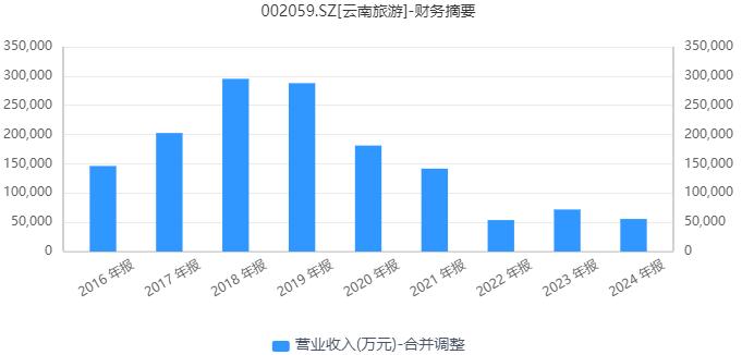 雖然擁有稀缺的旅游資源,但是在業績上,云南旅游卻沒有將優勢轉化為利潤。營收方面,公司在2018年達到高點后就快速下滑,這幾年營收規模縮水較嚴重,2024年公司的營收5.57億元,僅相當于2018年營收的18%左右。