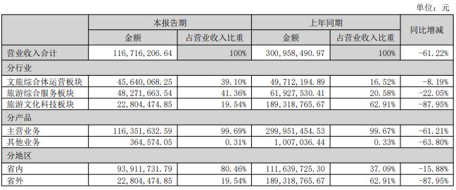 財報顯示,最近幾年,公司文旅科技板塊的營收占比均在50%以上,是公司的主要驅動力,然而今年上半年,公司文旅科技板塊營收僅有2280.45萬元,占比19.54%,縮水嚴重。
