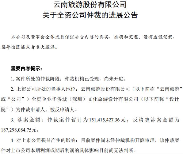 根據公司7月26日發布的公告,公司全資企業設計院就永州湘源文化旅游有限公司(以下簡稱“永州湘源”)未按照合同約定支付款項事宜向中國國際經濟貿易仲裁委員會提起仲裁,仲裁案件金額暫計為1.51億元,該仲裁立案已獲受理,尚未開庭審理。設計院于近日收到通知,中國國際經濟貿易仲裁委員會決定受理永州湘源提出的反請求申請,對方請求退回1億元啟動資金及支付占用費2304.67萬元等多項費用,涉及金額合計1.87億元。目前案件尚未經仲裁機構開庭審理。