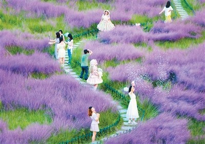廣西壯族自治區南寧園博園景區,粉黛亂子草盛情綻放,吸引了許多游客前來打卡拍照。