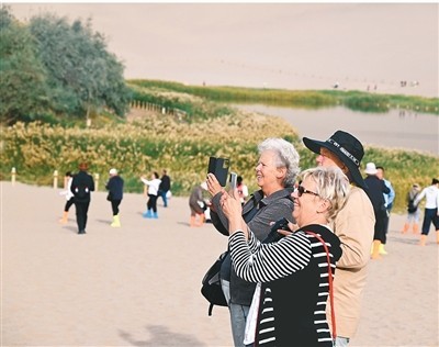 外國游客在甘肅省鳴沙山月牙泉景區游覽拍照。