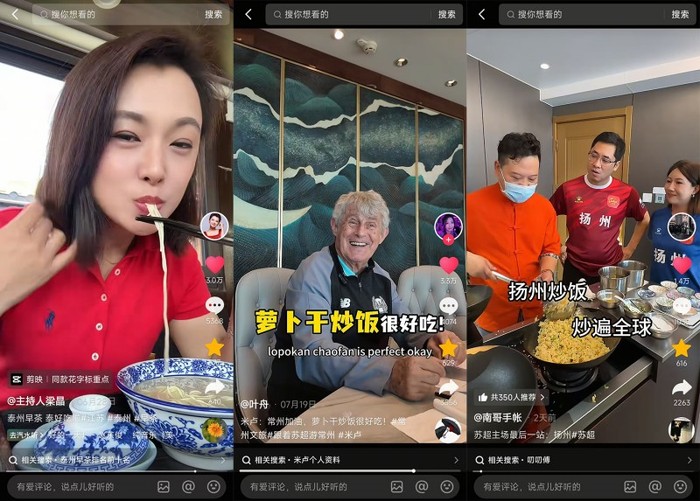 借助賽事熱度,江蘇省各地非遺美食“家底”也被輪番曝光。@主持人梁晶 在泰州觀賽時,發布美食視頻稱贊“在泰州叫醒我的不是鬧鐘,而是泰州的早茶”,獲數萬點贊;前國足國家隊主教練米盧現身常州隊比賽觀眾席,并用中文大贊“蘿卜干炒飯”好吃,向網友種草;江蘇本地達人@叨叨傅 輾轉多城觀賽,品嘗鎮江鍋蓋面,學做揚州炒飯,吃遍各地美食。數據顯示,5月10日至9月15日,抖音江蘇非遺餐飲相關團購訂單同比增長49%,銷售額同比增長209%。