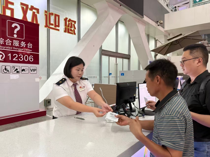 廣州南站綜合服務臺工作人員為旅客辦理業務,提供12306一站式服務