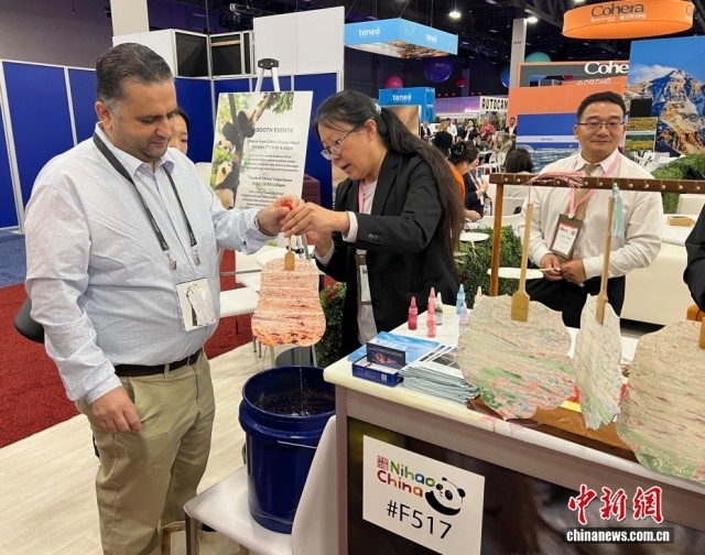 當(dāng)?shù)貢r間10月8日,2025年美國會議獎勵旅游展(IMEX America)繼續(xù)在拉斯維加斯舉行。這是全球會議及獎勵旅游領(lǐng)域最具影響力的展會之一。中國展臺舉辦“中華一刻”——中國非物質(zhì)文化遺產(chǎn)體驗等豐富多彩的活動,吸引眾多與會者感受中華文化魅力。圖為與會者在中國展臺體驗漆扇制作。