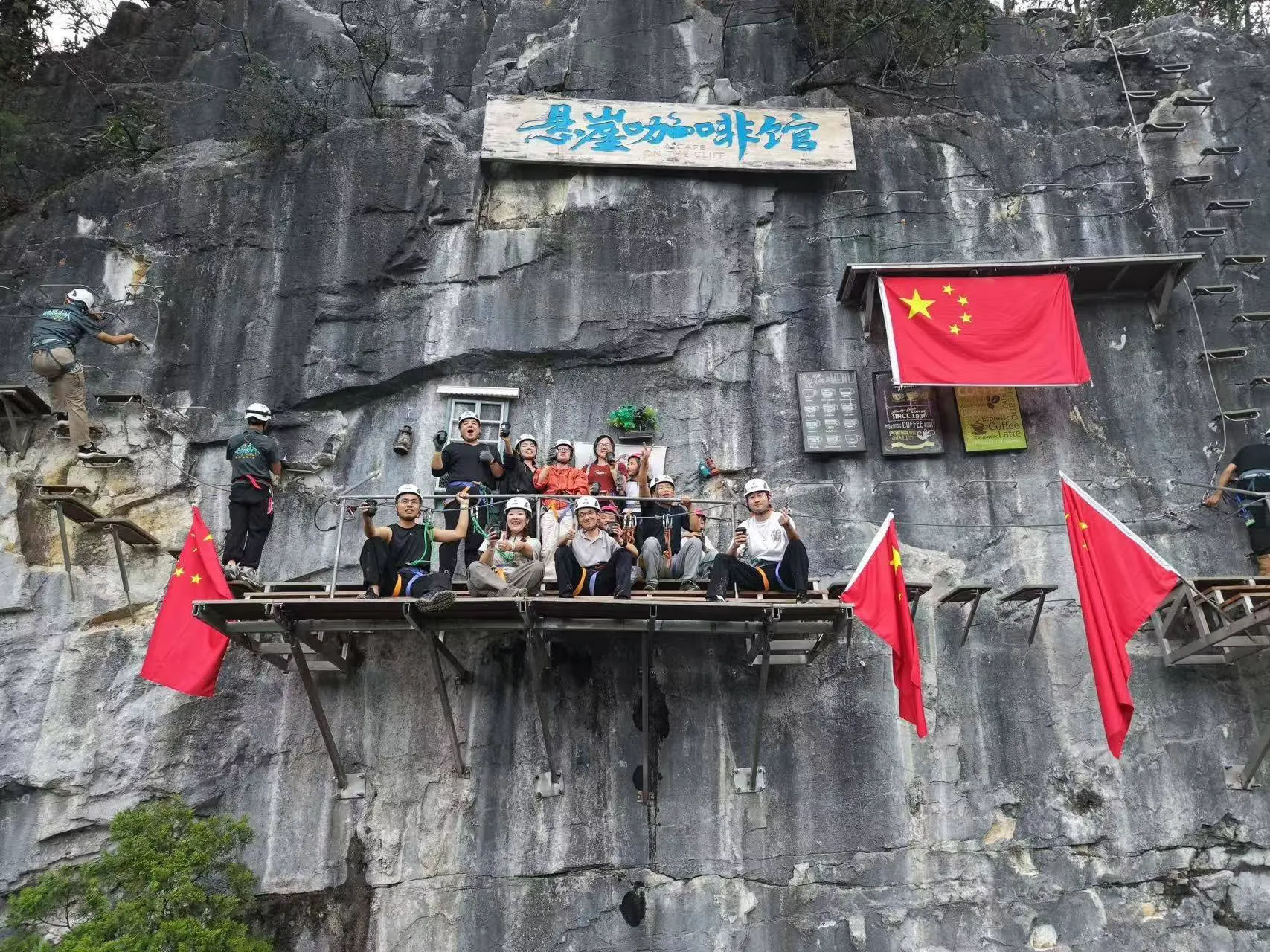 在距離地面200米的崖壁上喝上一杯咖啡,也是酷玩森林最受歡迎的項目之一。游客佩戴專業登山裝備,在教練陪同下沿固定路線攀登至懸崖中段的休息平臺。站在平臺上,山川云海盡收眼底,隨手拍都是 “朋友圈大片”,刺激又出片。