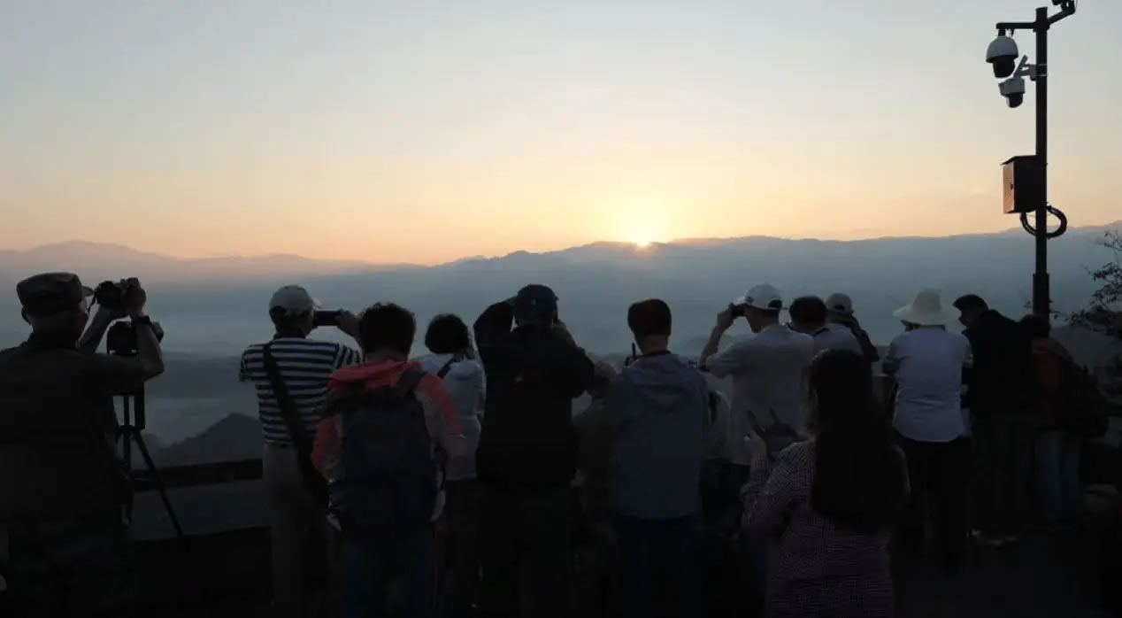 夜色未褪,寒意襲人,攝影師們背著專業(yè)設(shè)備,沿著登山步道向山頂進(jìn)發(fā)。當(dāng)?shù)谝豢|晨光穿透云層灑落在連綿的丹霞峰叢時(shí),赭紅色的山體仿佛披上了金色霞衣,在朝陽(yáng)的映照下熠熠生輝。陡峭巖壁與平緩山脊勾勒出極具張力的線條,丹霞地貌雄渾壯闊的肌理盡顯無(wú)遺。快門聲此起彼伏,攝影師們或俯身調(diào)整參數(shù),或借助三腳架耐心捕捉光影變化,專注記錄每一個(gè)精彩瞬間。