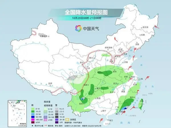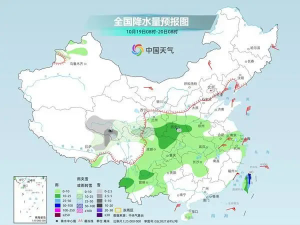 后天,新疆沿天山地區、青海東南部、川西高原北部等地部分地區有小雪或雨夾雪。陜西中部、河南西部、湖北南部、湖南西北部、四川南部、云南東北部、福建東南部、廣東東南部、臺灣島等地部分地區有中到大雨。