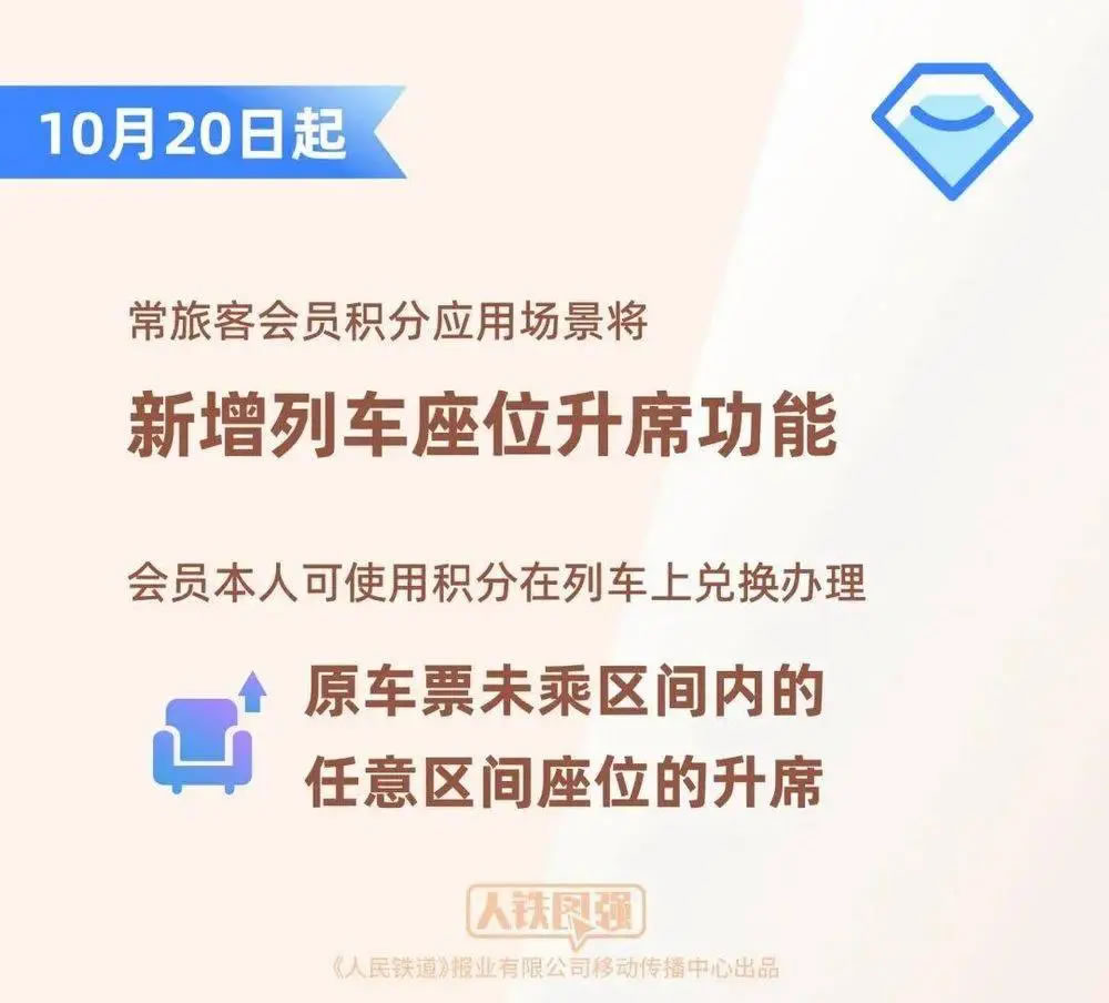 10月20日起,常旅客會員積分應用場景將新增列車座位升席功能,會員本人可使用積分在列車上兌換辦理原車票未乘區間內的任意區間座位的升席。乘車途中,會員可掃描座椅扶手上的“鐵路暢行”二維碼登記升席需求,也可直接聯系列車工作人員辦理;接到旅客升席需求后,列車工作人員將根據列車座席空余情況及時進行辦理。