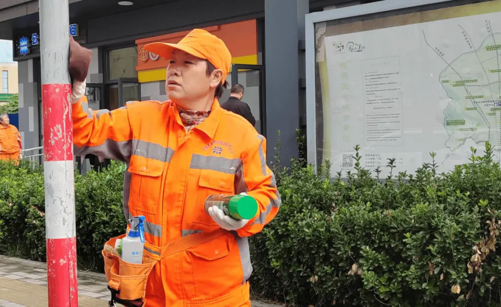 在槐蔭區,環衛工人馬增霞隨身攜帶“八寶袋”,對齊州路沿線的垃圾桶、路燈桿、公交站牌等進行清掃。“這個‘八寶袋’里有軟毛刷、硬毛刷、除膠劑、手套、噴壺等8種工具。”馬增霞介紹,“八寶袋”輕便易攜且取用便捷,可實現“一包在手,百污可除”,有效提升了主次干道人行道、交通出入口等重點區域的動態巡查處置效率;夾層內的清涼油、創可貼、速效救心丸,既為保潔人員提供安全防護,也能滿足市民應急需求。