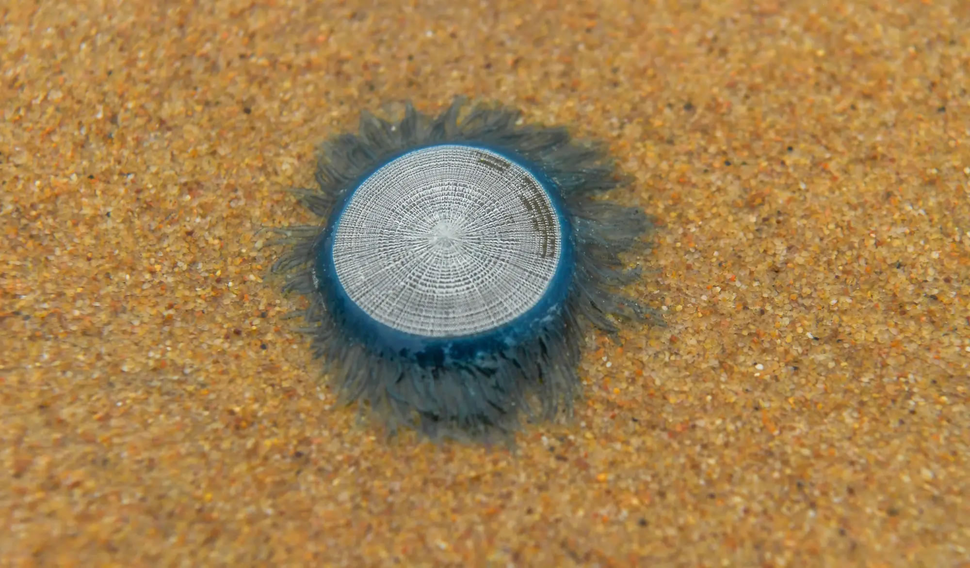 經(jīng)?谑匈Y規(guī)局聯(lián)同海南省海洋監(jiān)測預(yù)報(bào)中心專家取樣鑒定,這些圓形藍(lán)色生物為銀幣水母,其浮囊體硬而透明,質(zhì)輕呈圓盤狀,觸手上有刺絲囊,毒性相對較弱。該物種自身無游泳能力,其移動完全依賴海流驅(qū)動,本次銀幣水母上岸原因,或是受臺風(fēng)“風(fēng)神”影響,被強(qiáng)風(fēng)和大浪推上海岸。