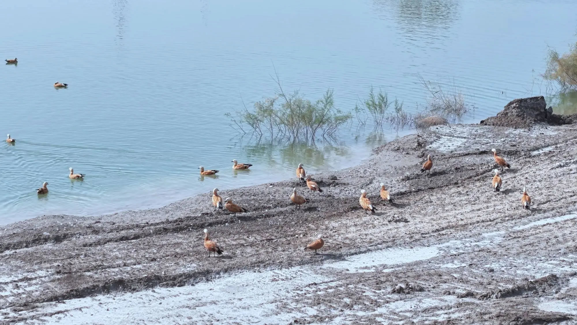 深秋時節,新疆輪臺縣草湖鄉可可橋村迎來大批遷徙候鳥。廣袤的戈壁荒灘上,大量赤麻鴨、灰雁在此集結棲息,甚為壯觀。