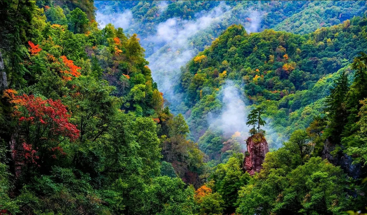 山河入秋,大地鎏金。走進國家級風景名勝區甘肅華亭關山蓮花臺,仿佛走進了五顏六色的童話世界——層林盡染,五彩繽紛,秋意在這里揮灑得淋漓盡致。空氣中浮動著泥土的溫潤與草木的清香,山間那些不知名的野花依然開得爛漫,如散落的星辰點綴林間。