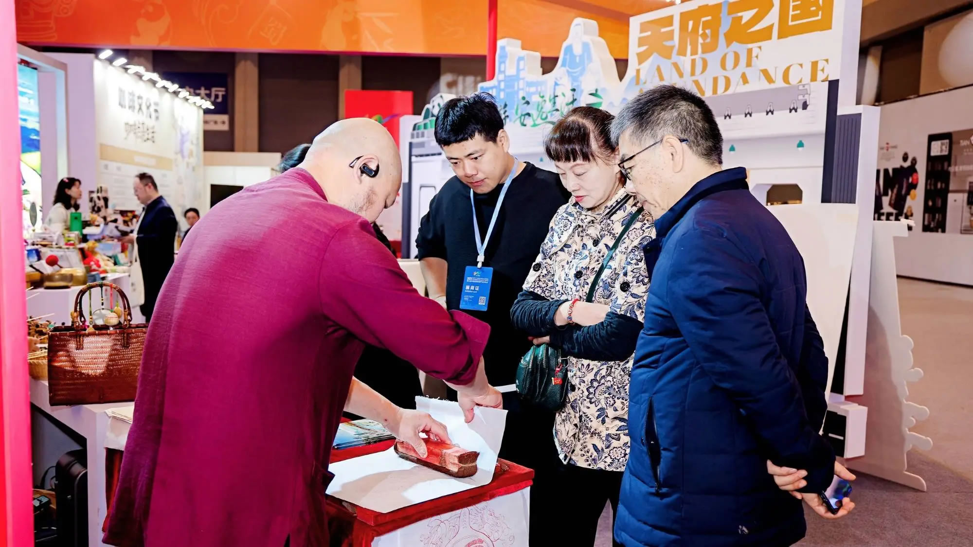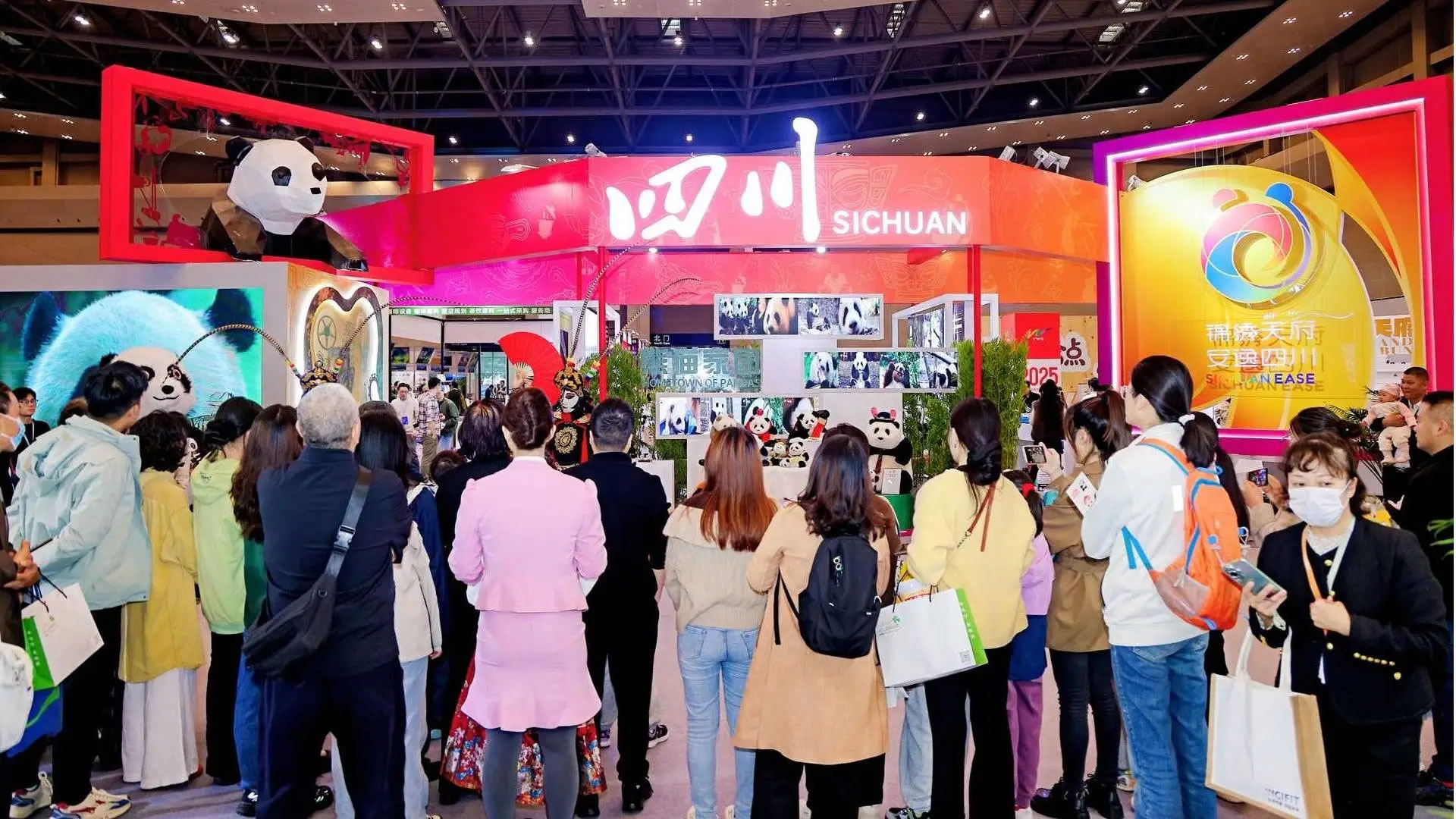 本次四川展臺位于展會核心區域,圍繞熊貓家園、古蜀文明、世界級旅游風景道等主題打造展區。現場不僅有諸葛羽扇綸巾杯套組等文創產品、缽缽雞等天府美食展示,宜賓面塑、長寧竹編等非遺活態體驗,還通過川劇變臉表演、“安逸熊貓”人偶巡游營造沉浸式氛圍。同時,線下文旅咨詢區提供線路與政策解讀,百萬粉絲達人巡館直播、“安逸直播間”系列活動同步開展,實現“線下體驗+線上云看展”雙向聯動。