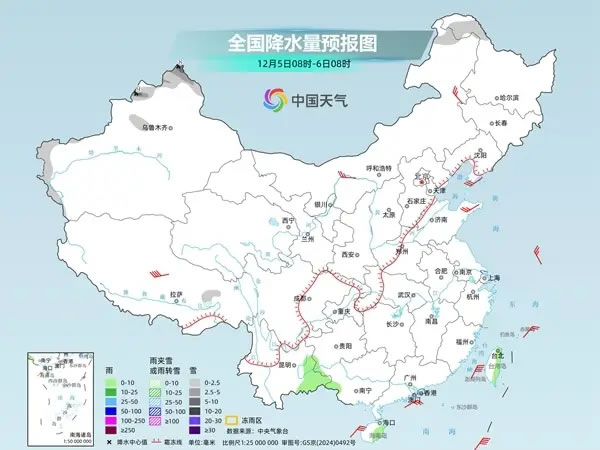 具體來看,今天,新疆北疆北部和南疆西部山區、內蒙古東北部、黑龍江西北部、西藏東部等地部分地區有小到中雪或雨夾雪,其中,新疆北疆北部等地有大雪。貴州西南部、云南東部、廣西西部、海南島、臺灣島等地部分地區有小雨。