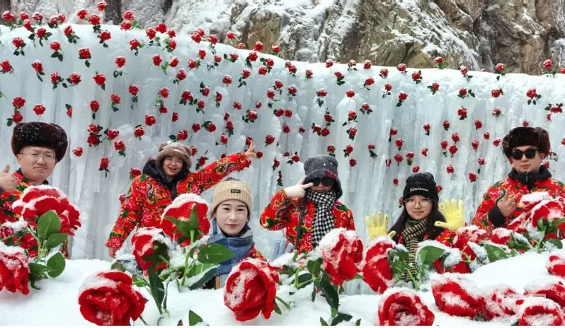 冰封的玫瑰、融入巖畫元素的雪雕、百米長的雪圈滑道,將景區打造成夢幻的冰雪秘境。身著多彩冬裝的游客們穿梭其間,或駐足觀賞或拍照打卡,不時發出陣陣贊嘆。“巖畫和冰雪結合,就像穿越到了冰河時代!”來自西安的游客李女士,一邊拍攝冰封玫瑰,一邊向同伴分享自己的感受。