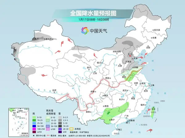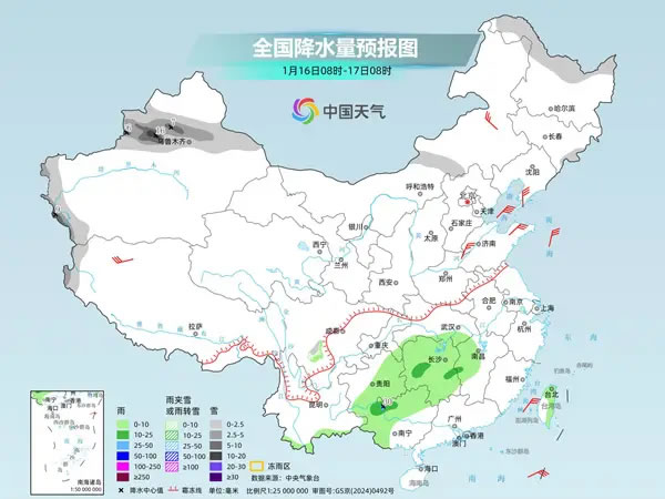 中央氣象臺預計,今天,新疆沿天山地區及南疆西部山區,黑龍江北部、吉林東部、西藏西部等地部分地區有小到中雪,其中,新疆沿天山西部地區和伊犁河谷等地部分地區有大到暴雪;江南中西部、貴州東部和南部、廣西西部和北部、云南南部、臺灣島東部等地部分地區有小到中雨,廣西西北部局地有大雨。