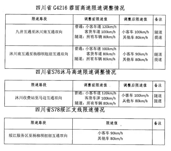 S76沐馬高速沐川收費站至馬邊互通雙向限速調整。調整前,小客車道限速每小時120公里,客貨車道限速每小時100公里,隧道內所有車輛限速每小時80公里。調整后,全路段(包括隧道)小客車限速每小時100公里,其他車輛限速每小時80公里。