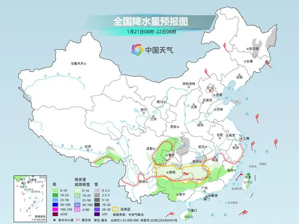 中國天氣網訊 今天(1月21日),南方雨雪繼續減少、減弱,但湖南、貴州等地部分地區仍有凍雨,需注意防范。明后天,中東部大部將進入雨雪間歇期。隨著寒潮和雨雪影響結束,后天起長江以南地區氣溫將陸續轉為偏高,但北方多地氣溫仍然低迷,需注意保暖。
