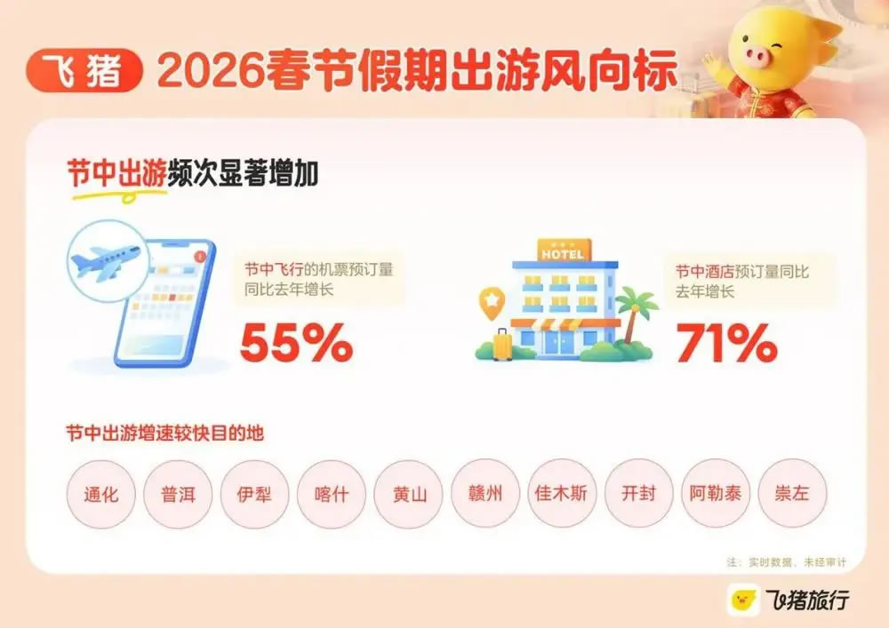 游客節中最愛去哪里?據飛豬觀察,長線的“3小時飛行圈”和短線的“2小時自駕圈”特征明顯,前者集中于一二線城市周邊300公里內的寶藏小城,后者集中于西南、西北、東北等典型的旅游城市。從目的地來看,通化、普洱、伊犁、喀什、黃山、贛州、佳木斯、開封、阿勒泰、崇左等城市的節中出游預訂增速較快。