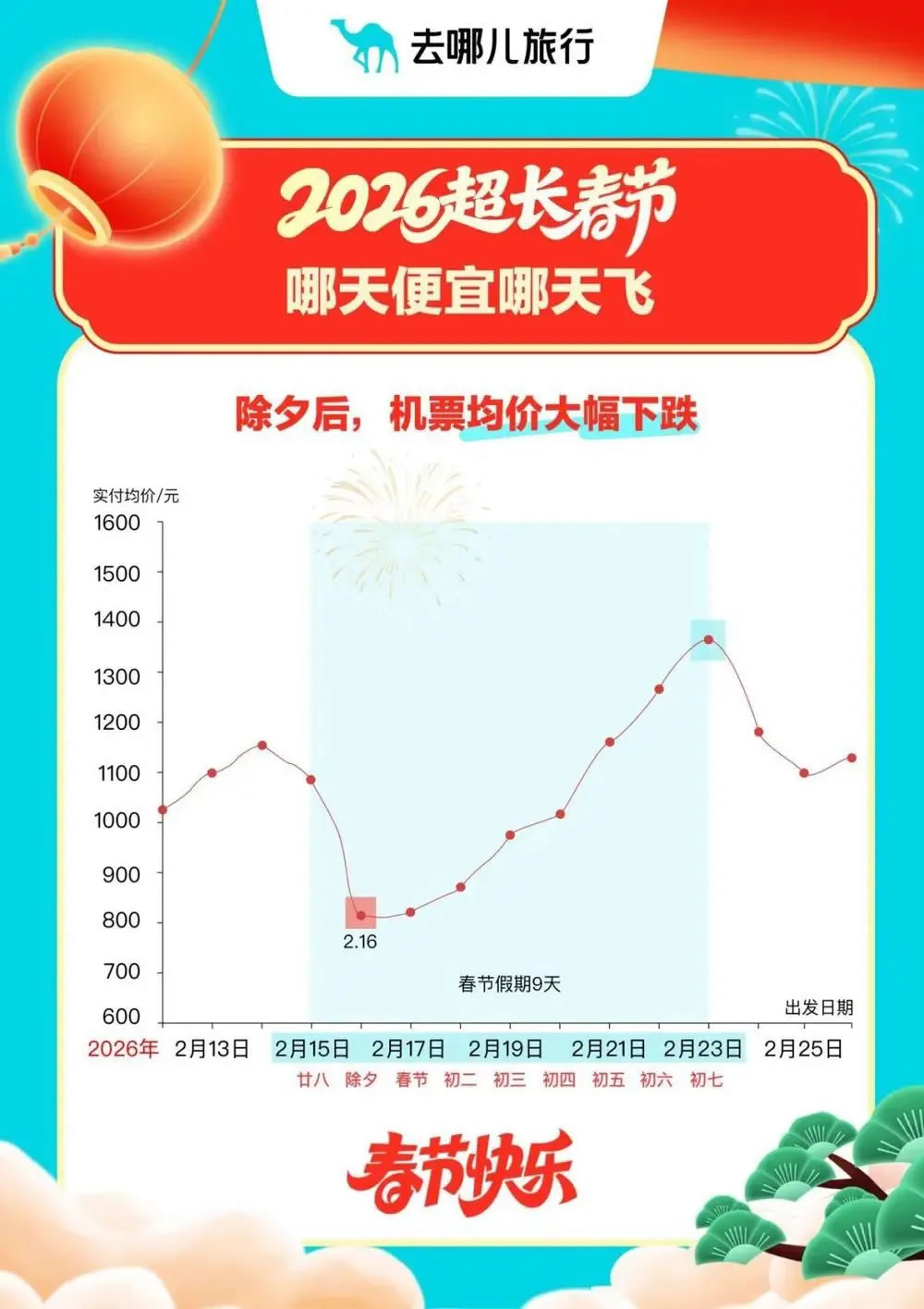 另據去哪兒旅行大數據,進入2月9日(農歷臘月二十二)節前一周,預訂機票出行的旅客量就開始逐日增加,到2月14日(二十七)達到節前高峰。機票價格則跟出行量成正比,到2月15日(二十八)春節假期第一天,機票價格開始回落,2月16日(二十九,即除夕)降至節日期間最低點,17日-19日機票價格都相對劃算。